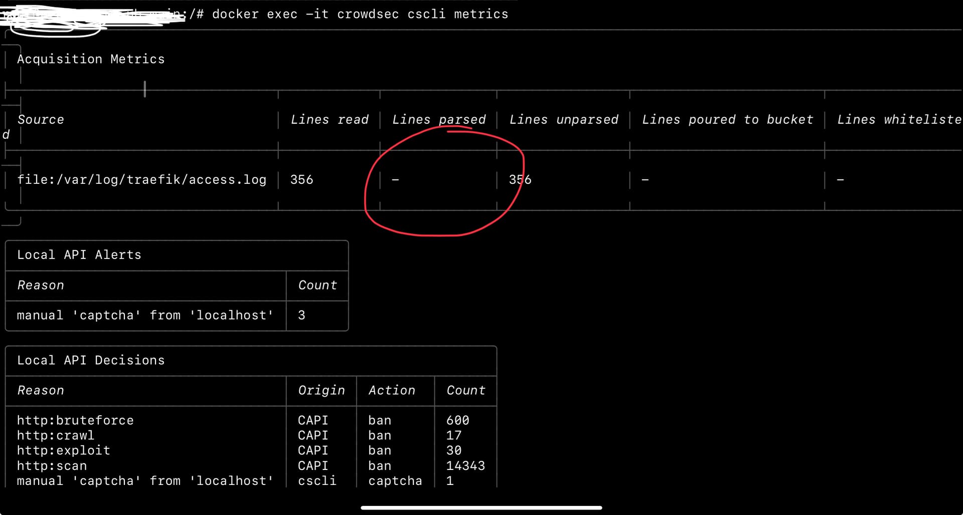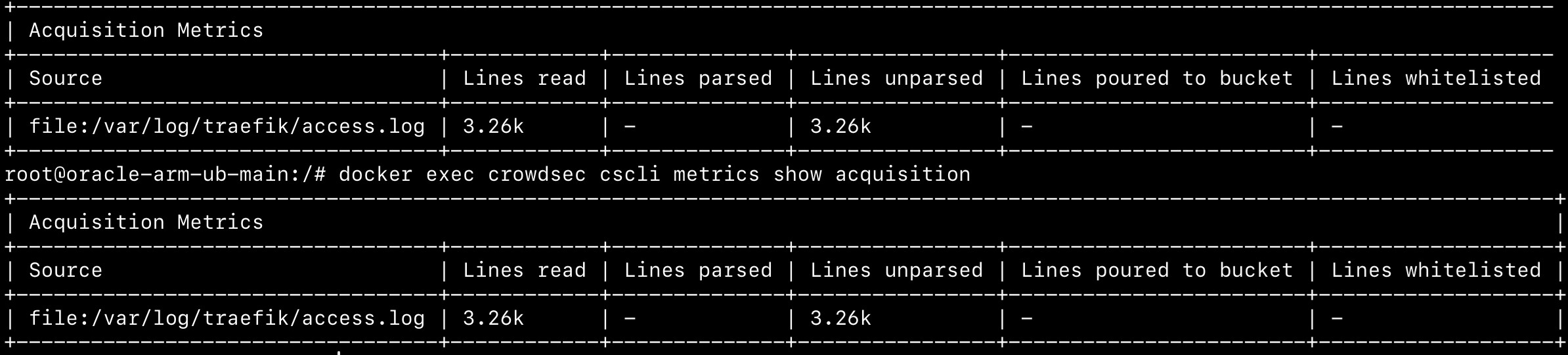 docker exec crowdsec cscli metrics show acquisition